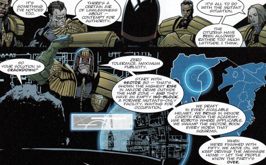 Wurde durch John Wagner in „Tour of Duty“ die positive Seite des Charakters Dredd in den Vordergrund gestellt, sein Gerechtigkeitssinn, sein Sinn für Verantwortung und sein unnachgiebiges Eintreten für eine bestimmte Sache, so erleben wir Judge Dredd in „Day of Chaos“ von seiner faschistoiden Seite. Sein Crackdown in Sektor 50 ist nichts weiter als das komplette Ausrollen eines brutalen Polizeistaates, ohne Rücksicht auf irgendwelche Umstände. Bestes Zitat von Dredd des gesamten Bandes ist eine Antwort auf die Frage eines Kadetten, ob seine Herangehensweise nicht ein wenig „heavy handed“ sei? Dredd antwortet: „heavy handed beats soft touch every time“.