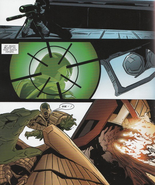 Es ist genau dieses Spannungsverhältnis zwischen ausgeprägten Gerechtigkeitssinn und absolut faschistoider Implementierung des selbigen, was den Charakter Dredd über die Jahre so interessant blieben ließ. Generell ist es faszinierend zu beobachten wie Hauptautor John Wagner seit den siebziger Jahren es immer wieder schafft, diesen Charakter und dessen Welt regelmäßig zu erneuern. Auf der einen Seite werden schnelle, unterhaltsame Geschichten geliefert, die sich klassischer Plotlines und Methoden bedienen. Gleichzeitig lässt es sich Wagner seit Jahrzehnten nicht nehmen, auf einer Metaebene Kritik an aktuellen Themen zu üben. Dies geschieht meist in klassisch britischem tiefschwarzem Humor. In „The Fourth Faction“ bekommt die Leistungsethik ihr Fett ab. Dort wird in wenigen Seiten das Schicksal des ehemaligen All Pro Light Hippoweight Champion Max Capacity beschrieben. Capacity ist ein alternder Fattie, der in einem letzten Wettkampf zeigen will, dass er nicht zum alten Eisen gehört. Hierbei liegt seine Leistung darin, möglichst viel zu essen und sich nicht zu übergeben. In bester britischer Tradition stopft er weiter in sich Essen hinein, obwohl um ihn herum ein Massaker vollzogen wird. Seine Ehefrau sorgt dafür, dass in dem gesamten Kugelhagel der Richter nicht verletzt wird, zumindest nicht solange, bis er ihren Ehemann zum Sieger erklärt hat. Das ganze Schauspiel ist dabei so grotesk, dass man sich kaum traut zu lachen.